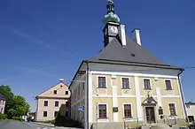 The Baroque town hall built in 1716–1719 is unique with its high gabled roof and clock tower in all four directions.[2][5]