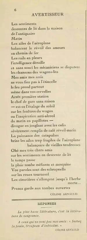Céline Arnauld (born Carolina Goldstein on 20 September 1885, Călăraşi (Romania), died on 23 December 1952 by suicide in Paris) was a writer associated with Dadaism.