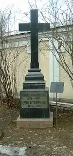 In 1916 the composer went blind, although he was still able to compose small pieces by means of dictation.[31] Cui died on 13 March 1918 from cerebral apoplexy and was buried next to his wife Mal'vina (who had died in 1899) at the Smolensky Lutheran Cemetery in Petrograd (now Saint Petersburg). In 1939 his body was reinterred in Tikhvin Cemetery at the Alexander Nevsky Monastery, to lie beside the other members of The Five.[32]