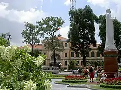 The square was originally named Place de la Cathédrale (roughly translated "Cathedral Square") dated back to the French colonial period.[1] In 1903, the colonial government erected a bronze statue of French Catholic priest Pigneau de Behaine and juvenile Prince Nguyễn Phúc Cảnh[2] in the center of the square. It was brought down in October 1945[3] leaving behind an empty statue pedestal. There was no statue on the site until 1959 under the First Republic of Vietnam, when a new statue of Our Lady of Peace (Vietnamese: Tượng Đức Bà Hòa Bình) was erected in honor of the Blessed Virgin Mary.[4] The square itself was called Hòa Bình Square (Vietnamese: Công trường Hòa Bình, literally "Peace Square"). In May 1964, the South Vietnamese government renamed it to President John F. Kennedy Square (Vietnamese: Công trường Tổng thống John F. Kennedy) honoring the assassinated U.S. President.[5] The current name was coined after the Fall of Saigon, literally means "Paris Commune Square".