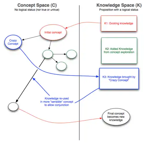 Crazy concepts are concepts that seem absurd as an exploration path in a design process. Both C-K theory and practical applications have shown that crazy concepts can benefit the global design process by adding extra knowledge, not to be used to pursue that "crazy concept" design path, but to be used to further define a more "sensible concept" and lead to its eventual conjunction. The following image is a graphical representation of this process.