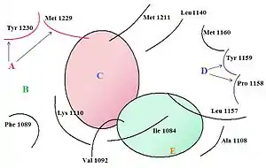 Series of quinoline c-Met inhibitors with an acylthiourea linkage have been explored. Multiple series of analogs have been found with alternative hinge binding groups (e.g. replacement of the quinoline group), replacement of the thiourea linkage (e.g. malonamide, oxalamide, pyrazolones) and constraining of the acyclic acylthiourea structure fragment with various aromatic heterocycles. Further refinement included the blocking of the p-position of the pendant phenyl ring with a fluorine atom.[12] Example of interactions between c-Met and a small molecules (marked in a red circle) of class II are as follows: The scaffold of c-Met lodges into the ATP pocket by three key hydrogen bonds, the terminal amine interacts with the ribose pocket (of ATP), the terminal 4-fluorophenyl group is oriented in a hydrophobic pocket and pyrrolotriazine plays the role of the hinge-binding group.[12]