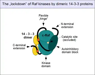 Note that 14-3-3 binding of Raf enzymes is not necessarily inhibitory: once Raf is open and dimerizes, 14-3-3s can also bind in trans, bridging two kinases and "handcuffing" them together to reinforce the dimer, instead of keeping them away from each other.[42] Further modes of 14-3-3 interactions with c-Raf also exist, but their role is not well known.[43]