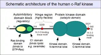 Between the autoinhibitory domain block and the catalytic kinase domain, a long segment - characteristic to all Raf proteins - can be found. It is highly enriched in serine amino acids, but its precise sequence is poorly conserved across related Raf genes. This region appears to be intrinsically unstructured, and very flexible. Its most likely role is to act as a natural "hinge" between the rigidly folded autoinhibitory and catalytic domains, enabling complex movements and profound conformational rearrangements within the molecule.[26] This hinge region contains a small, conserved island of amino acids, that are responsible for 14-3-3 protein recognition, but only when a critical serine (Ser259 in human c-Raf) is phosphorylated. A second, similar motif is found on the extreme C-terminus (centered around the phosphorylatable Ser 621) of all Raf enzymes, but downstream of the kinase domain.