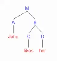 Where [node A] John c-commands [node B]. This means that [node A] also c-commands [node C] and [node D], which means that John c-commands both [likes] and [her].