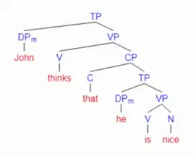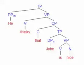 The notion of c-command can be found in frameworks such as Binding Theory, which shows the syntactic relationship between pronouns and its antecedent.[4] The binding theory framework was first introduced by Chomsky in 1973 in relation to the treatment of various anaphoric phenomena, and has since been revised throughout the years. Chomsky's analysis places a constraint on the relationship between a pronoun and a variable antecedent. As such, a variable cannot be the antecedent of a pronoun to its left.