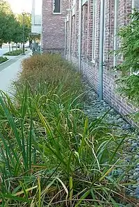 * Sanitary System: When initially constructed, the building was not connected to the campus sanitary (sewage) system. Instead the building washrooms were fitted with composting toilets[12] that allowed waste to fall down through a stainless steel chutes into composting bins located in the basement of the building. Urine filtering through the compost medium forms a leachate, which initially was drained and combined with drainage from the lavatories and released into a linear bioswayle or "greywater trench", designed by the landscape architect and the mechanical engineer. The concept was to enable the plants in the greywater trench to benefit from the nutrients contained in the leachate, and eventually allow the finished compost to be used within the landscaped areas surrounding the building. However, samples collected of the leachate and finished compost in 2011 revealed these materials did not meet the provincial regulatory environmental and health & safety standards. Consequently, the leachate is now being drained to sewer and the compost product is being disposed of to a sanitary landfill. The university is currently considering options to either replace the composting system with a conventional plumbing and toilet system, or another alternate system such as a water reclamation and recycle process.