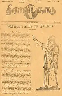 Annadurai's interest in politics made him join the Justice party in 1935.[10] The Justice party was formed by non-Brahmin elites in 1917.[11] The Justice party originated with the Madras United League which was initially started as a work group that helped non-Brahmin students in Madras with accommodation and later grew into a political party under the efforts of leaders like C. Natesa Mudaliar, Sir Pitti Theagaroya Chetty and Dr. T. M. Nair. The party was named South Indian Liberal Federation (S. I. L. F.) – popularly known as Justice party.[11] The party had been in power in Madras Presidency since self-governance was introduced in 1920, until it was defeated by the Indian National Congress in 1937.[12] By the time Annadurai joined the Justice party, Periyar E. V. Ramasami was the party president. Annadurai served as the sub-editor of the Justice magazine. He later became the editor for Viduthalai (Freedom in English) and was also associated with the Tamil weekly paper, Kudi Arasu. He started his own journal Dravida Nadu (named after the Dravida Nadu – an independent state that the party called for). In 1944, Periyar renamed the Justice party to Dravidar Kazhagam and gave up contesting in the elections.[13]