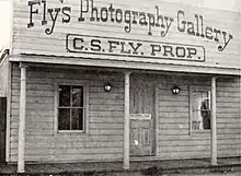 In Tombstone they immediately opened a temporary photography studio inside of a tent.[3] In July, 1880, they completed construction on a 12-room boarding house at 312 Fremont Street in Tombstone that housed their photography studio and gallery in the back, called the "Fly Gallery".[3] Mollie Fly actively managed Fly's Gallery when her husband was away. She was one of the few female photographers of the era, taking pictures of anyone who could pay the studio price of 35 cents.[3] It's unknown how they divided photographic duties between them, although all known photographs are attributed to him.[2]