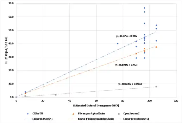 Orthologs were primarily found in primates, although many different mammals also exhibited sizeable sequence similarity to the human C15orf54 sequence. Below is a table of selected orthologs sorted by date of divergence for the C15orf54 gene, including closely and distantly related orthologs.[12][13] C15orf54 was shown to evolve relatively quickly and evenly over time with a faster rate than both Cytochrome C and Fibrinogen Alpha.