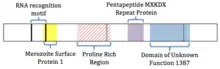 This gene contains some known domains, such as: an RNA recognition motif, a Merozoite surface protein (MSP-1), a pentapeptide repeat MXKDX, and a domain of unknown function (DUF1387). These domains could give a hint of what the function of this gene is.[6]