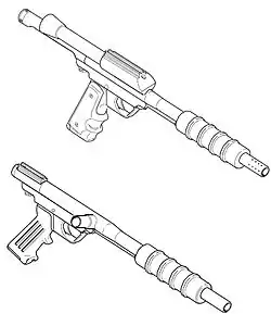 The term Nelson-based lends itself to the Nelson Paint Company and its first marker, the Nel-Spot 007.[4][5] The basic valve design found in these early markers laid the groundwork for many other manufacturers to develop their own paintball guns. The Nelson design is in-line which means that the bolt, hammer, and valve follow the barrel and form a line as opposed to being stacked.[6] It fires from a closed bolt position meaning that when it fires the bolt is secured into the breech end of the barrel with a paintball loaded.[7] In comparison, the bolt in an open bolt marker is not secured until the marker fires, at which point the paintball is chambered, fired, and the bolt is then re-opened. Another characteristic of the Phantom that varies within the Nelson-based family of markers is that it features the original breech drop design as opposed to the bore drop variation of the design, meaning that the paintballs drop into breech, or rear of the barrel, rather than dropping into the bore of the barrel.[8]