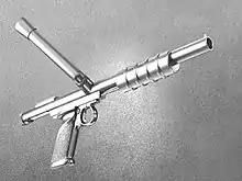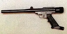 The original Phantom Revolution was an unfinished semi-automatic paintball marker developed during the early 1990s. It featured an electrically powered rotary breech which was activated by an on-board computer system and microphone which responded to the sound of the marker being fired. Another notable innovation in the Revolution was its boltless design. The breech, which rotated on an axis in a similar fashion to that of the cylinder of a revolver, allowed a paintball to be fed into the breech which would then align with the firing chamber, creating a seal. The maximum rate of fire was 7 balls per second, or 14 with a two-hole breech.[10] A few working prototypes were demonstrated at the 1996 National Professional Paintball League World Cup in Orlando, Florida by Mike Casady.[11] However, production was halted indefinitely in 1996 due to a technical problem with the motor pinion drive. Additionally, there were several markers being produced or developed at the time which used a switch for a trigger and a circuit board to control the feed and/or the pneumatic firing sequence such as the Smart Parts Shocker. The sport of paintball saw explosive growth during this decade and as the industry became more lucrative, many patent disputes and lawsuits occurred. CCI effectively sidestepped them by focusing solely on the pump paintball market. All together enough parts for 50 prototypes were fabricated, 12 were assembled,[12] and all but two have been accounted for by Casady.