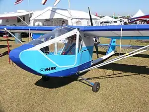 - Two seats in tandem, with the rear seat raised for visibility. Based on the Classic, but with a less sloped windshield, longer nose, larger tail surfaces, flatter floor and reinforced tail boom. Available as a fully assembled US Special Light Sport Aircraft. It incorporates the semi-symmetrical airfoil and streamlined extruded aluminum wing struts from the Hawk Sport. 186 flying in 2011. Standard empty weight 420 lb (191 kg) with a 950 lb (431 kg) gross weight. Engines available include the two-stroke, 52 hp (39 kW) Rotax 503, 65 hp (48 kW) Rotax 582, 55 hp (41 kW) Hirth 3202, 65 hp (48 kW) Hirth 3203, 80 hp (60 kW) Hirth F30, 100 hp (75 kW) Hirth 3701 and the four-stroke 60 hp (45 kW) HKS 700E.[1][2][3][4][6][13][14][15]