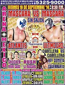 The main event match for the 81st Anniversary show was the culmination of a storyline feud between Atlantis and Último Guerrero that had its start several years prior. In 2005 Atlantis was a well established, veteran tecnico who held the CMLL World Tag Team Championship with Blue Panther.[11] During a match on June 25, 2005 against Guerrero and Rey Bucanero Atlantis turned on his partner during the match and cost them the titles.[11] Following the match the now Rudo Atlantis joined up the group Los Guerreros del Infierno ("The Infernal Warriors"), who renamed the group Los Guerreros de la Atlantida ("The Warriors of Atlantis") out of respect for their new co-leader.[12] Atlantis, Último Guerrero and Negro Casas won the CMLL World Trios Championship and held it for 166 days, before losing it on January 1, 2009, to El Hijo del Fantasma, Héctor Garza and La Máscara.[13] On November 2, 2009, Atlantis won his fourth CMLL World Tag Team Championship, this time teaming with Último Guerrero to defeat Místico and Negro Casas for the championship.[14] They later lost the Tag Team championship to Averno and Mephisto on February 1, 2010.[14] In late 2009 it was rumored that Los Guerreros de la Atlantida had split up, but when Atlantis and Último Guerrero teamed up on CMLL's Sin Salida show, to prove that the rumors were not be true.[15] On November 2, 2010, Guerrero and Dragón Rojo, Jr., who replaced an injured Atlantis, defeated Mr. Águila and Héctor Garza to win the CMLL World Tag Team Championship.[16] After the title win, Rojo, Jr. was made an official member of Los Guerreros de la Atlantida.[17] Following Dragón Rojo's induction into the group Atlantis teamed less and less with his team mates. In June, 2011 Atlantis replaced an injured Shocker and teamed with the tecnico team of Delta and Guerrero Maya, Jr. in the Forjando un Ídolo tournament, which they eventually went on to win.[18] After weeks of tension between Atlantis and Último Guerrero, CMLL held a press conference on August 11, where Atlantis officially turned technico and left Los Guerreros de la Atlantida.[19] Guerrero and Atlantis faced each other in a big grudge match on September 23, which saw Atlantis pick up the win.[20] On the August 3 Super Viernes show, Guerrero and Rojo, Jr. lost the CMLL World Tag Team Championship to Atlantis and Diamante Azul, ending their reign at 640 days, the longest reign in the title's history.[21] On November 16, Atlantis announced that he was officially forming a stable named Los Reyes de la Atlantida ("The Kings of Atlantis") with Delta and Guerrero Maya, Jr. to help him combat Los Guerreros del Infierno.[22][23][24] On the August 3 Super Viernes show, Atlantis and Diamante Azul defeated Dragón Rojo, Jr. and Último Guerrero to win the CMLL World Tag Team Championship.[25] In early 2013 the long running feud between Atlantis and Último Guerrero came to the forefront of CMLL booking once more. The two were booked for the 2013 Torneo Nacional de Parejas Increibles tournament, forcing the two rivals to team up. Before their qualifying round both Atlantis and Gurrero stated that they would put their differences aside for the sake of the tournament. Atlantis and Guerrero displayed the teamwork they had developed by being partners in Los Guerreros del Atlantida for several years as they defeated the teams of Valiente and Pólvora, Diamante Azul and Euforia and finally Dragón Rojo, Jr. and Niebla Roja to qualify for the finals of the tournament.[26][27] The finals took place as part of the 2013 Homenaje a Dos Leyendas show and saw La Sombra and Volador, Jr. win the match and the tournament. Following the loss a frustrated Atlantis attacked Último Guerrero and tore his mask apart.[28] Atlantis subsequently made a Luchas de Apuestas challenge to Último Guerrero that was not immediately accepted.[29] The two rivals officially signed the contract for the mask vs. mask match on March 21, but did not announce an actual date for the match.[30] At the same press conference it was announced that CMLL would commemorate Atlantis' 30 year anniversary as a wrestler with a special Super Viernes show on May 3.[31] During the celebration of Atlantis' 30th anniversary as a wrestler Guerrero appeared after a match to berate Atlantis, which turned out to be a distraction for the real Último Guerrero to attack Atlantis from behind. The two identically dressed Guerreros proceeded to beat up Atlantis and tear his mask apart. Following the match Último Guerrero introduced his brother "Gran Guerrero".[32] The much anticipated and hyped Mask vs. Mask match between Guerrero and Atlantis at the 80th Anniversary Show on September 13 never came to fruition as the two were defeated in a Relevos Suicidas match by La Sombra and Volador Jr., who instead advanced to the Lucha de Apuestas against each other.[33] During the semi-final match of the 2014 Juicio Final show Atlantis and Último Guerrero were once again on opposite sides of the six-man tag team match. In the first fall Guerrero pulled Atlantis' mask and pinned him, when Atlantis tried to use the same tactics in the second fall he was disqualified and lost the match for his team. Following the match Guerrero insisted on CMLL officially announcing the match between the two. Moments later Juan Manual Mar, representing the CMLL executive team came to the ring and announced that the two would finally face off in a Lucha de Apuestas match for their masks at the 81st Anniversary show.[1][2]