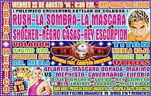 Mexican professional wrestling promotion held their weekly Super Vierenes show on August 8, 2014 following up on events and fall-out from their major event, El Juicio Final ("Final Justice") the previous week. The show featured six matches in total, including Negro Casas' first Arena México match after being shaved bald the prior week. Casas had lost a high-profile Lucha de Apuestas, or "bet match" to rival Rush and as a result was forced to have all his hair shaved off.[1] In the main event of the August 8 Super Viernes Negro Casas teamed up with Último Guerrero and Shocker to take on the Rush led trio known as Los Ingobernables, which also included La Máscara and La Sombra. The match was contested under Six-man "Lucha Libre rules" tag team match with each team quickly winning a fall before the third and deciding fall. In the end the bald Casas, Shocker (who had also lost his hair to Rush) and Último Guerrero defeated the Los Ingobernables trio to gain a small measure of revenge.