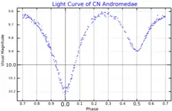 The light curve of CN Andromedae shows a primary eclipse, with its brightness dropping down to 10.21 magnitude, and a secondary one down to a magnitude of 9.9.[3] This phenomenon repeats with a cycle of approximately 11.1 hours, with period decreasing in time due to the mass transfer from one star to the other.[6]
