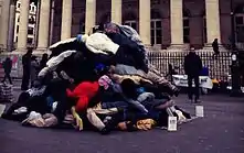 Early December, COMBO collaborated with other street artists and realized a pop-up installation[7] place de la Bourse in the 2nd arrondissement, minutes away from AFP’s headquarters, to pay a tribute to the 162 homeless persons who died in the street over the six previous months.
