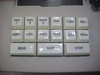 The keyboard of the CPT 4200 had action keys for "skip", "read" and "stop", mode keys for "word", "line", "paragraph," and "page." Pressing "read" transferred a word, line, paragraph, or page (depending on which mode key had been selected) from the input tape to both the typewriter and the output tape. Line boundaries (aka printer margins) recorded on the input tape were ignored or retained depending on whether or not the "adjust" key had been selected. Alternatively, pressing "skip" moved past the corresponding amount of text on the input tape without sending it to the typewriter or to the output tape.