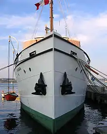 She was retired from active service on November 28, 1969, and was transferred to the Bedford Institute of Oceanography (BIO) for use as a museum ship. Acadia was declared a National Historic Site in 1976.[1] On February 9, 1982, the BIO transferred CSS Acadia to the Maritime Museum of the Atlantic for preservation and interpretation. She is moored at the Museum's North Wharf and open to visitors from May to October. In September 2003 she rode out Hurricane Juan with ease, despite being the oldest vessel in Halifax Harbour. Acadia is known for being one of the last ships in Halifax that was home to an official ship's cat used for rodent control.[7] Acadia is drydocked every five years to preserve her hull, formerly at the Dartmouth Marine Slips and at Halifax Shipyard in more recent years.