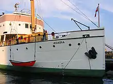 Acadia served Canada for more than five decades from 1913 to 1969, charting the coastline of almost every part of Eastern Canada including pioneering surveys of Hudson Bay. She was also twice commissioned into the Royal Canadian Navy (RCN) as HMCS Acadia, the only ship still afloat to have served the RCN in both World Wars. Today she is a museum ship, designated as a National Historic Site of Canada, moored in Halifax Harbour at the Maritime Museum of the Atlantic.[1]