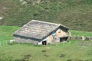 The cabaña pasiega is a type of mixed popular architecture (housing-livestock building called a housebarn), typical of the Cantabrian mountains, above all, from the upper valleys of Asón and Pas, whose contrasted origin dates back to the 16th century.[1]