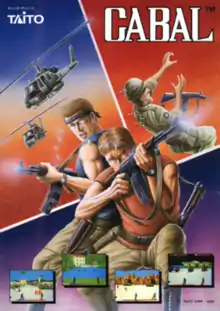 Cabal (カベール, Kabēru) is a 1988 arcade shooter video game originally developed by TAD Corporation and published in Japan by Taito, in North America by Fabtek[5] and in Europe by Capcom.[1] In the game, the player controls a commando, viewed from behind, trying to destroy various enemy military bases.[6] The game was innovative for the era, but only a mild success in the arcades, and became better known for its various home conversions.[5]