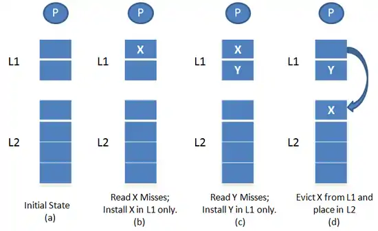 As illustrated in Figure 2, initially consider both L1 and L2 caches to be empty (a). Assume that the processor sends a read X request. It will be a miss in both L1 and L2 and hence the block is brought into L1 from the main memory as shown in (b). Now, again the processor issues a read Y request which is a miss in both L1 and L2. So, block Y is placed in L1 as shown in (c). If block X has to be evicted from L1, then it is removed from L1 and placed in L2 as shown in (d).