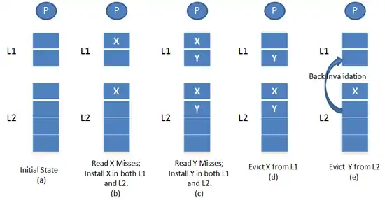 As illustrated in Figure 1, initially consider both L1 and L2 caches to be empty (a). Assume that the processor sends a read X request. It will be a miss in both L1 and L2 and hence the block is brought into both L1 and L2 from the main memory as shown in (b). Now, assume the processor issues a read Y request which is a miss in both L1 and L2. So, block Y is placed in both L1 and L2 as shown in (c). If block X has to be evicted from L1, then it is removed from L1 only as shown in (d). If block Y has to be evicted from L2, it sends a back invalidation request to L1 and hence block Y is evicted from L1 as shown in (e).