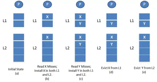 As illustrated in Figure 3, initially consider both L1 and L2 caches to be empty (a). Assume that the processor sends a read X request. It will be a miss in both L1 and L2 and hence the block is brought into both L1 and L2 from the main memory as shown in (b). Now, again the processor issues a read Y request which is a miss in both L1 and L2. So, block Y is placed in both L1 and L2 as shown in (c). If block X has to be evicted from L1, then it is removed from L1 only as shown in (d). If block Y has to be evicted from L2, it is evicted from L2 only as shown in (e).