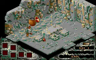 When Karadoc touches an object, he can push it around, unless it is too heavy (a potion of strength allows pushing heavier objects). Touching an object also causes the context menu to be enabled. When the context menu is enabled, the fire button is used to select an action from the menu instead of jumping. The possible actions depend on the type of object, and are represented with icons. They include things like investigate, pull, pick up, drink, open, insert, give and some others. Items which are picked up land in Karadocs inventory, and get additional actions, like cast for spells. One item at a time also can be readied, usually a weapon, which makes the fire button throw or use the readied item instead of jumping.