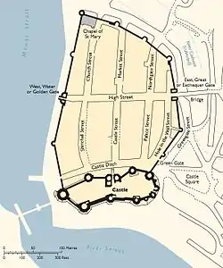 Traditionally Caernarfon's design and defences have been thought to have been inspired by the growth of the bastides. The bastides were new planned towns created in both France and English-held Gascony during the period, characterised by grids of straight streets, often defended by combinations of castles and town walls.[8] More recent research, however, has shown that English town design played a more significant role in shaping Caernarfon and other Edwardian town plans.[9] In the case of Caernarfon, the town plan and walls were adapted to fit around the site of the former Norman castle on the site, which lay just outside the new town and was used a market place.[10][nb 1]