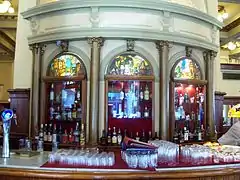 Café Las Violetas opened on 21 September 1884. It was rebuilt in the 1920s with stained-glass windows, curved glass doors and Italian marble floors. The stained-glass windows followed the sketches in watercolor and ink for designers in 1928. These sketches, which were preserved, were made in accordance with the recommendations of architect Anonio Estruch, who had experience of similar works in the cafe "Tortoni". He was responsible for the installation.[1]