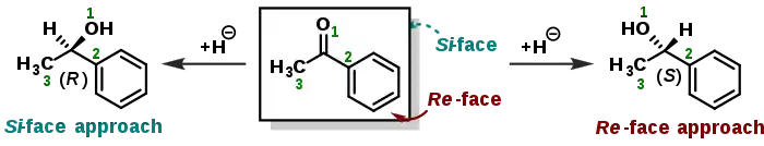 Stereochemistry also plays a role assigning faces to trigonal molecules such as ketones. A nucleophile in a nucleophilic addition can approach the carbonyl group from two opposite sides or faces. When an achiral nucleophile attacks acetone, both faces are identical and there is only one reaction product. When the nucleophile attacks butanone, the faces are not identical (enantiotopic) and a racemic product results. When the nucleophile is a chiral molecule diastereoisomers are formed. When one face of a molecule is shielded by substituents or geometric constraints compared to the other face the faces are called diastereotopic. The same rules that determine the stereochemistry of a stereocenter (R or S) also apply when assigning the face of a molecular group. The faces are then called the Re-face and Si-face.[16][17] In the example displayed on the right, the compound acetophenone is viewed from the Re-face. Hydride addition as in a reduction process from this side will form the (S)-enantiomer and attack from the opposite Si-face will give the (R)-enantiomer. However, one should note that adding a chemical group to the prochiral center from the Re-face will not always lead to an (S)-stereocenter, as the priority of the chemical group has to be taken into account. That is, the absolute stereochemistry of the product is determined on its own and not by considering which face it was attacked from. In the above-mentioned example, if chloride (Z = 17) were added to the prochiral center from the Re-face, this would result in an (R)-enantiomer.