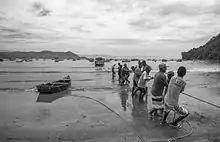 The people are of mixed African, indigenous, and European origins. Their origins and customs are similar to the caipiras who live further inland.[3] In literature the caiçaras are represented as traditional, primitive, isolated and self-sufficient fishing people. This is an inaccurate stereotype, since it was only with the arrival of motor boats and fishing vessels in the 20th century that the communities were led to partly or entirely abandon agriculture in favour of fishing.[4]