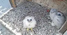 Cal Falcons is a website and social media community featuring three live streaming webcams trained on a peregrine falcon nest site atop Sather Tower at the University of California, Berkeley. Cal Falcons is known for its extensive social media presence and following.[1] The live stream runs continuously throughout the year, recording all facets of the falcon lifecycle, including courtship, breeding, and raising young. The site launched with two cameras in January 2019.[2]