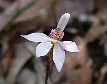 Caladenia alata, commonly known as the fairy orchid,[2] is a plant in the orchid family Orchidaceae and is found in south-eastern Australia and New Zealand. It is a ground orchid with small, usually short-lived flowers, which have relatively stiffly held petals and sepals and reddish-purple bars on the labellum.