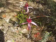 Caladenia cruciformis, commonly known as the crucifix spider orchid,[2] or red cross spider orchid,[3] is a plant in the orchid family Orchidaceae and is endemic to a small area in Victoria. It is a rare ground orchid with a single, sparsely hairy leaf and a single dark red to crimson flower with blackish tips.