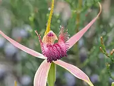 Up to three red, yellow and green flowers are borne on a stalk 25–50 cm (10–20 in) tall. The flowers are 6–15 mm (0.2–0.6 in) long and 5–10 mm (0.2–0.4 in) wide, making them one of the largest among Western Australian spider orchids. The bases of the sepals and petals are linear to lance-shaped and held stiffly for about one-third, then suddenly narrow. The dorsal sepal is erect, linear to lance-shaped, 4.5–7 cm (2–3 in) long and 3–6 mm (0.1–0.2 in) wide at the base with a yellow-brown glandular tip up to 25 mm (1 in) long. The lateral sepals are spreading and downcurved, 5–8 cm (2–3 in) long and 3.5–8 mm (0.1–0.3 in) wide at the base with a tip similar to the one on the dorsal sepal. The petals are 4–6 cm (2–2 in) long and 3.5–5 mm (0.1–0.2 in) wide at the base, slightly ascending then slightly curved downwards and sometime lack glandular tips. The labellum is dark pink with red stripes and ends in a dark tip. It is linear to heart-shaped, 20–28 mm (0.8–1 in) long and 13–20 mm (0.5–0.8 in) wide and curves downward at the front. The sides curve upwards and have a fringe of narrow teeth up to 9 mm (0.4 in) long but suddenly decreasing in length about half-way towards the tip of the labellum. There are four rows of pale maroon, golf stick-shaped calli in the centre of the labellum for at least three-quarters of its length, but decreasing in size towards its tip. Flowering occurs from mid-August to October.[2][3][4]