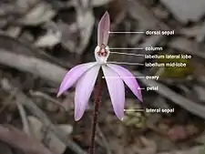 The single white or pink flower is borne on a spike up to 150 mm (6 in) high. The dorsal sepal is erect, linear in shape, 7–12 mm (0.3–0.5 in) long, 1–2 mm (0.04–0.08 in) wide with a pointed end. The lateral sepals and petals are usually 6–12 mm (0.2–0.5 in) long, about 2 mm (0.08 in) wide, with their outer surfaces densely covered with a band of short, reddish-brown glandular hairs. The labellum is egg-shaped, about 6 mm (0.2 in) long and wide, white or pinkish with three lobes and prominent red stripes. The mid-lobe is small and pointed with small teeth on the edge and several rows of yellow-tipped calli in the centre. The lateral lobes are prominent, broad and protrude past the mid-lobe. The column is 5–7 mm (0.2–0.3 in) long, curves inwards and has narrow wings. Flowering occurs in September and October and is followed by a non-fleshy, dehiscent capsule containing a large number of seeds. It is similar to Caladenia carnea but is distinguished from it by its single flower, earlier flowering period and red stripes on the labellum and column.[2][3][4]