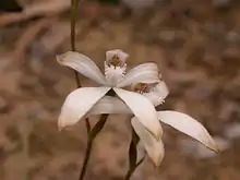 Caladenia ustulata, commonly known as brown caps, is a plant in the orchid family Orchidaceae and is endemic to New South Wales and the Australian Capital Territory. It was first formally described in 2007 by David Jones who gave it the name Stegostyla ustulata and published the description in The Orchadian.[1] In 2010 Gary Backhouse changed the name to Caladenia ustulata and published the change in The Victorian Naturalist.[2] The specific epithet (ustulata) is a Latin word meaning "scorched", "singed" or "browned".[3] Brown caps occurs in the southern tablelands and south-west slopes, which includes the Australian Capital Territory.[4]