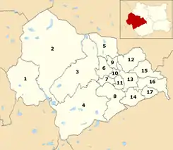 Calderdale is divided into 17 wards, each ward having three councillors for a total of 51 councillors. Councillors serve four-year terms, with one-third of the council elected every year except every fourth year when no councilors are elected.