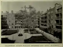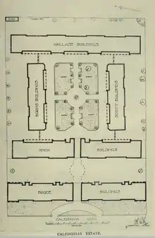 The Estate consists of five blocks built in a mixture of Victorian Gothic and Arts and Crafts styles. The five blocks, Carrick House, Irvine House, Burns House, Scott House and Wallace House, are named for Scottish locations and writers (including Robert Burns, Sir William Wallace and Sir Walter Scott). Two blocks, Carrick and Irvine, are parallel to the road (these blocks were originally called Bruce and Knox) and the remaining three, Scott, Burns and Wallace, are organised around a large courtyard.