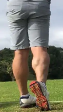The calf (Latin: sura, plural calves) is the back portion of the lower leg in human anatomy.[1] The muscles within the calf correspond to the posterior compartment of the leg. The two largest muscles within this compartment are known together as the calf muscle and attach to the heel via the Achilles tendon. Several other, smaller muscles attach to the knee, the ankle, and via long tendons to the toes.