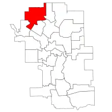 | Starting at the intersection of the north Calgary city boundary with the west Calgary city boundary; then 1. east along the north city boundary to Simons Valley Road NW; 2. south along Simons Valley Road NW and Beddington Trail NW to Country Hills Boulevard NW; 3. west along Country Hills Boulevard NW to Shaganappi Trail NW; 4. southwest along Shaganappi Trail NW to John Laurie Boulevard NW; 5. northwest along John Laurie Boulevard NW to Sarcee Trail NW; 6. north along Sarcee Trail NW to Country Hills Boulevard NW; 7. northwest along Country Hills Boulevard NW to 112 Avenue NW; 8. west along 112 Avenue NW to the west Calgary city boundary; 9. north along the west Calgary city boundary to the starting point. | |||