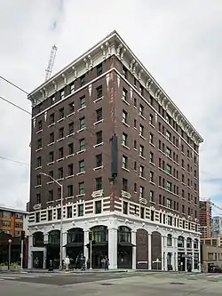 The Calhoun Hotel, later known as the Palladian Apartments and currently the Kimpton Palladian Hotel is a historic hotel building located in downtown Seattle, Washington. Constructed in 1909, The building was built on the recently regraded northeast corner of Second Avenue and Virginia Streets by Scott Calhoun (1874-1952), a well known attorney and Seattle's Corporation Counsel who helped form the Port of Seattle. He commissioned prominent local Architect W. P. White to design an eight-story hotel building, containing 153 rooms on the upper floors and retail at ground level. It was the first building to be completed on the site of the Denny Regrade.[1] It was listed on the National Register of Historic Places on April 23, 2013.[2] Converted to apartments by the 1980s, In 2014 it was restored back into a hotel and is currently run by the Kimpton Hotels & Restaurants brand as the Kimpton Palladian Hotel.