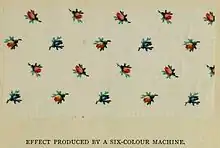 Thomas Bell patented a printing technique in 1783 that used copper rollers. In 1785, Livesey, Hargreaves and Company put the first machine that used this technique into operation in Walton-le-Dale, Lancashire. The production volume for printed cloth in Lancashire in 1750 was estimated at 50,000 pieces of 27 metres (30 yards); in 1850, it was 20,000,000 pieces.[9] The commercial method of calico printing using engraved rollers was invented in 1821 in New Mills, Derbyshire, in the United Kingdom. John Potts of Potts, Oliver and Potts used a copper-engraved master to produce rollers to transfer the inks.[11] After 1888, block printing was only used for short-run specialized jobs. After 1880, profits from printing fell due to overcapacity and the firms started to form combines. In the first, three Scottish firms formed the United Turkey Red Co. Ltd in 1897, and the second, in 1899, was the much larger Calico Printers' Association 46 printing concerns and 13 merchants combined, representing 85% of the British printing capacity.[12] Some of this capacity was removed and in 1901 Calico had 48% of the printing trade. In 1916, they and the other printers formed and joined a trade association, which then set minimum prices for each 'price section' of the industry.