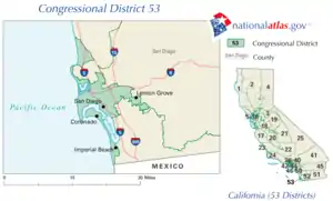 California's 53rd congressional district is a congressional district in the U.S. state of California. It is currently represented by Sara Jacobs, who succeeded Susan Davis following the 2020 election. It is scheduled to be the one California congressional district to be eliminated following the 2020 United States redistricting cycle.[4]