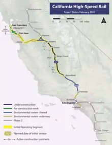 On February 18, 2016, the Rail Authority released its 2016 Draft Business Plan,[19] which significantly altered its near-term plans for the system implementation. While construction was always intended to begin in the Central Valley, the Initial Operating Section (IOS) has always had two options: extend from the Central Valley northward toward the Bay Area (the IOS-North, San Jose to Bakersfield), or southward to Southern California (IOS-South, Merced to San Fernando Valley). In the 2012 and 2014 Business Plans the goal was to implement the IOS-South, but a 2016 analysis of the funding available and time necessary to bring an IOS online the rail authority proposes the IOS-North be implemented instead. The proposal, named the Silicon Valley to Central Valley Line, is expected that sufficient funding will be available to bring this segment online by 2025.[20] The rail authority state its commitment to pursue additional funding to complete the Phase 1 system by 2029.[20]