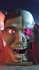 The CIA features an extensive collection of sideshow memorabilia that Crew and Ferguson, both avid fans and historians of the American sideshow, had collected over the years. The venue, painted with bright, garish circus colors, displays cryptotaxidermy, pickled punks and vintage banners for sideshow attractions and over the years has featured such oddities and hoaxes as a Fiji mermaid, the skull of "the world's smallest Freemason", the severed head of Sasquatch, the severed arm of Claude de Lorraine and a fairy skeleton.[1][2][3][5] The CIA's most notable attraction, however, may be the preserved corpse of Achile Chatouilleu, an American circus performer who died in 1912 and requested his body be put on display in the clown makeup and attire he had worn throughout his life.[1][6] Although Crew leased the body for six months in 2002, he claims that the owners "forgot" to retrieve it and the corpse remains at the CIA to present day in a hermetically sealed glass coffin, the body itself embalmed with arsenic.[1][3] Chatouilleu's corpse is such a prominent fixture of the CIA that the LA Weekly newspaper ranked the venue in its "Best of LA 2006" list as "Best Place to Find a Dead Clown".[2][7]
